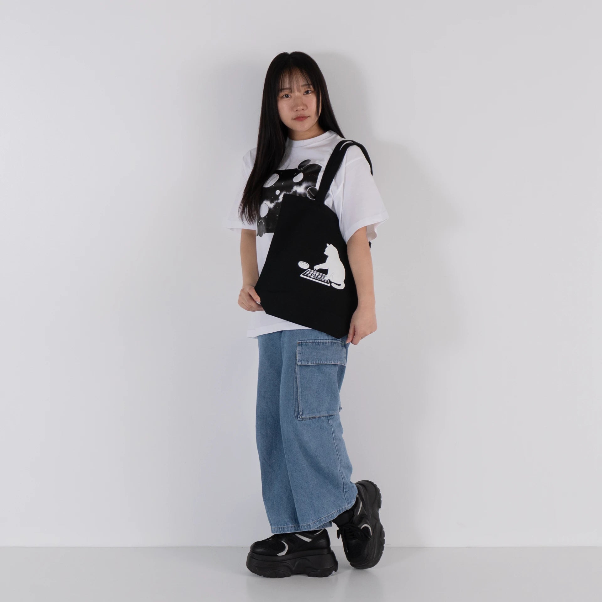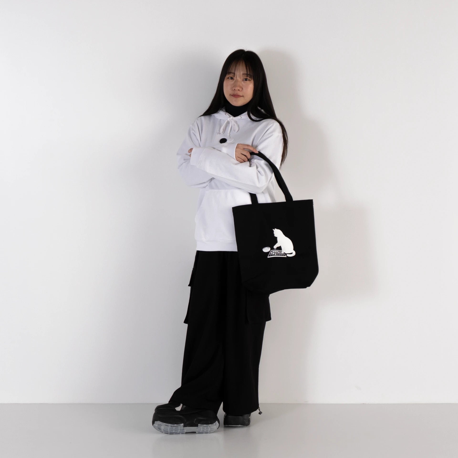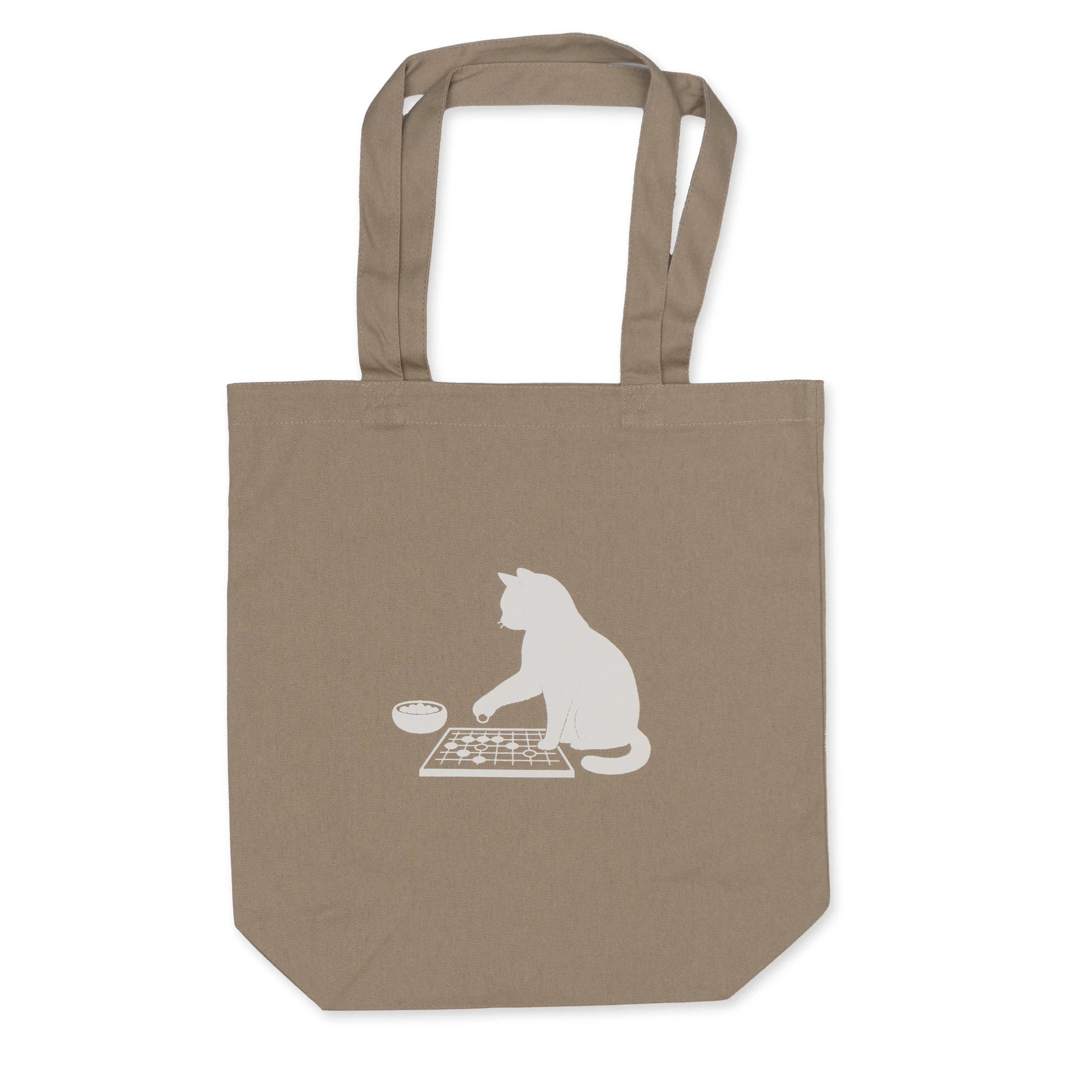囲碁に向き合う一匹の猫を、静かなシルエットで表現したトートバッグです。盤面に手を伸ばす仕草は、思考と遊びの境界を曖昧にし、囲碁という知的な遊戯をやわらかく日常に落とし込みます。