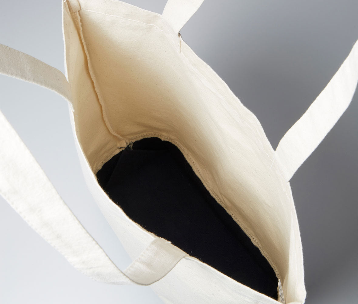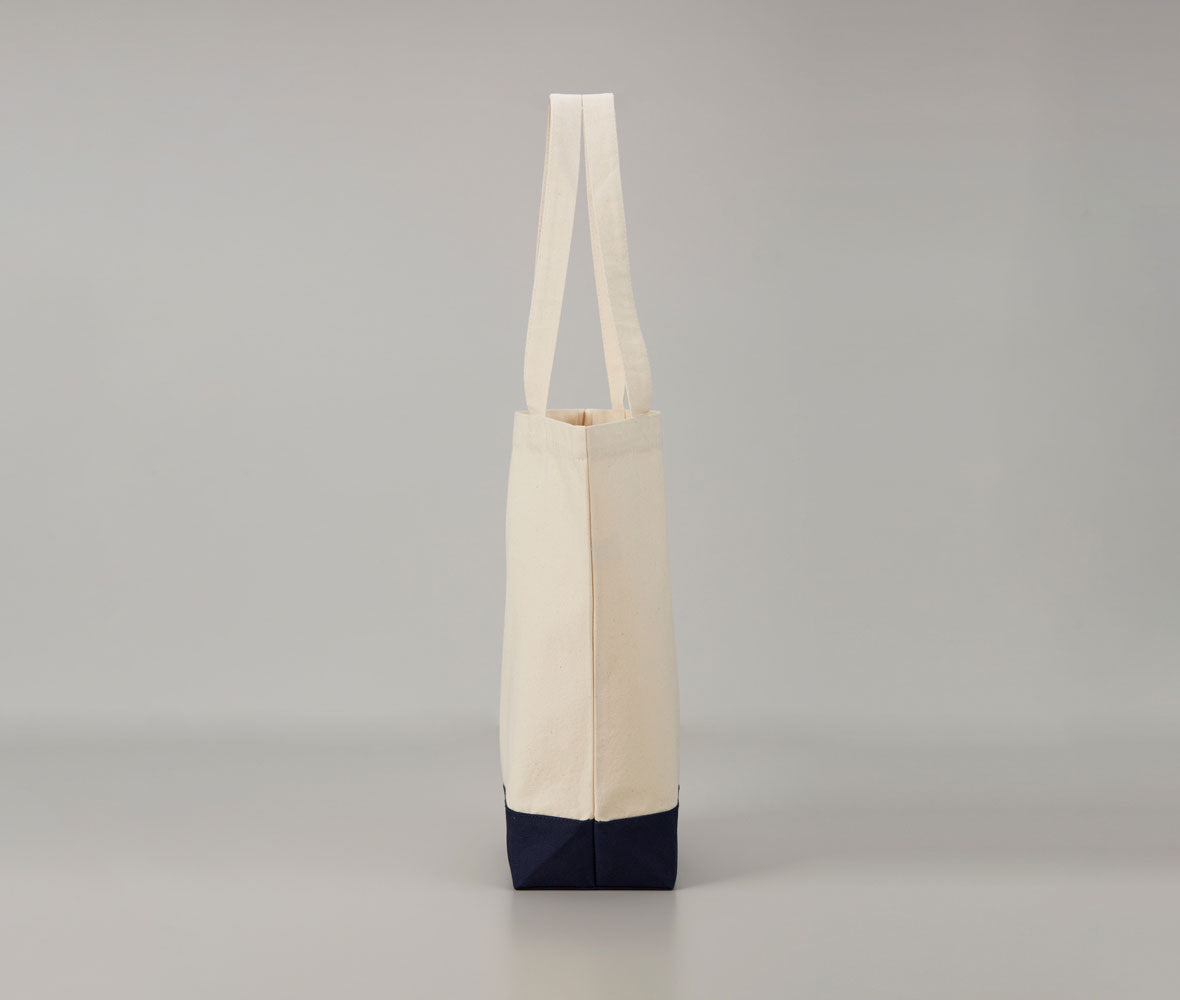素材には綿100%のキャンバス生地を使用しており、しっかりとした厚みと耐久性を備えています。日常使いに適した約10Lの容量で、書籍やタブレット、ちょっとした買い物まで無理なく収まります。ハンドルは肩掛けしやすい長さで設計されており、使い勝手にも配慮しています。